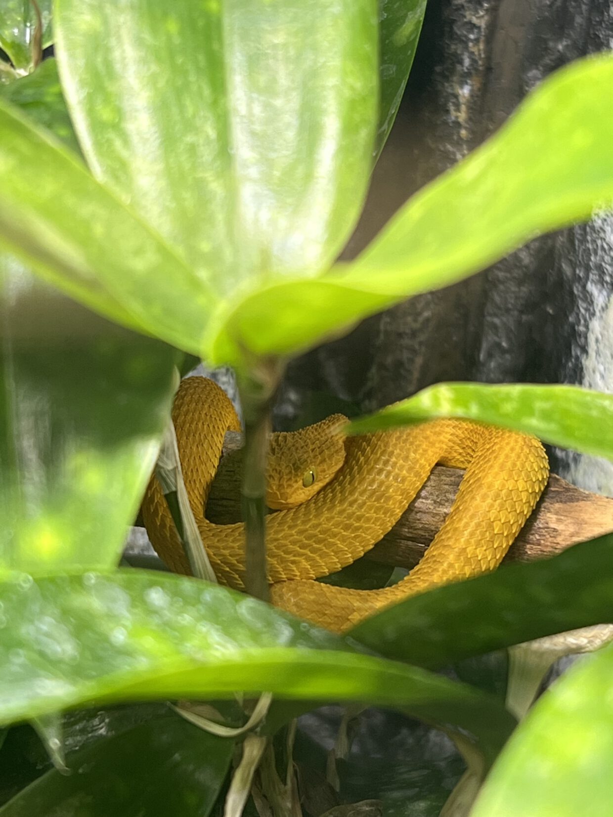 Tagsüber sehe ich die Bushvipern eigentlich nie. Sie liegen oft gut versteckt hinter Ästen oder Blättern. Gegen Abend werden die Tiere aktiver und beginnen, ihr Terrarium zu erkunden. Persönlich hat sich mir gezeigt, dass sie das Futter abends besser annehmen als zur Mittagszeit. Unter einem LED-Strahler kommt ihre Färbung besonders schön zur Geltung. Mein Weibchen strahlt in einem wunderschönen Gelb, mein Männchen in einem kräftigen Rot.